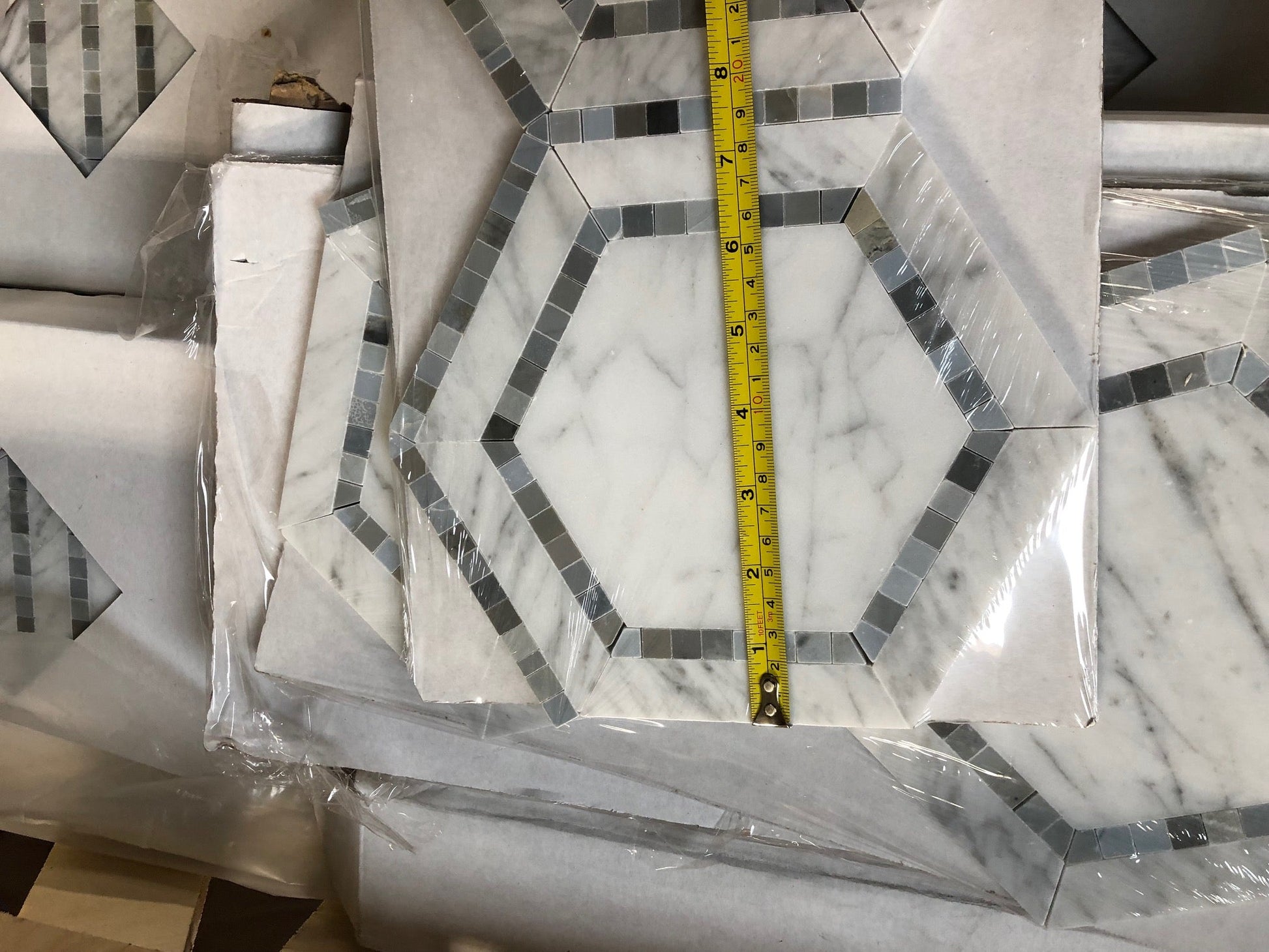 | Nombre del producto | Mosaico hexagonal de mármol blanco de Carrara (italiano) con azul grisáceo de 5 x 5 3/8 |