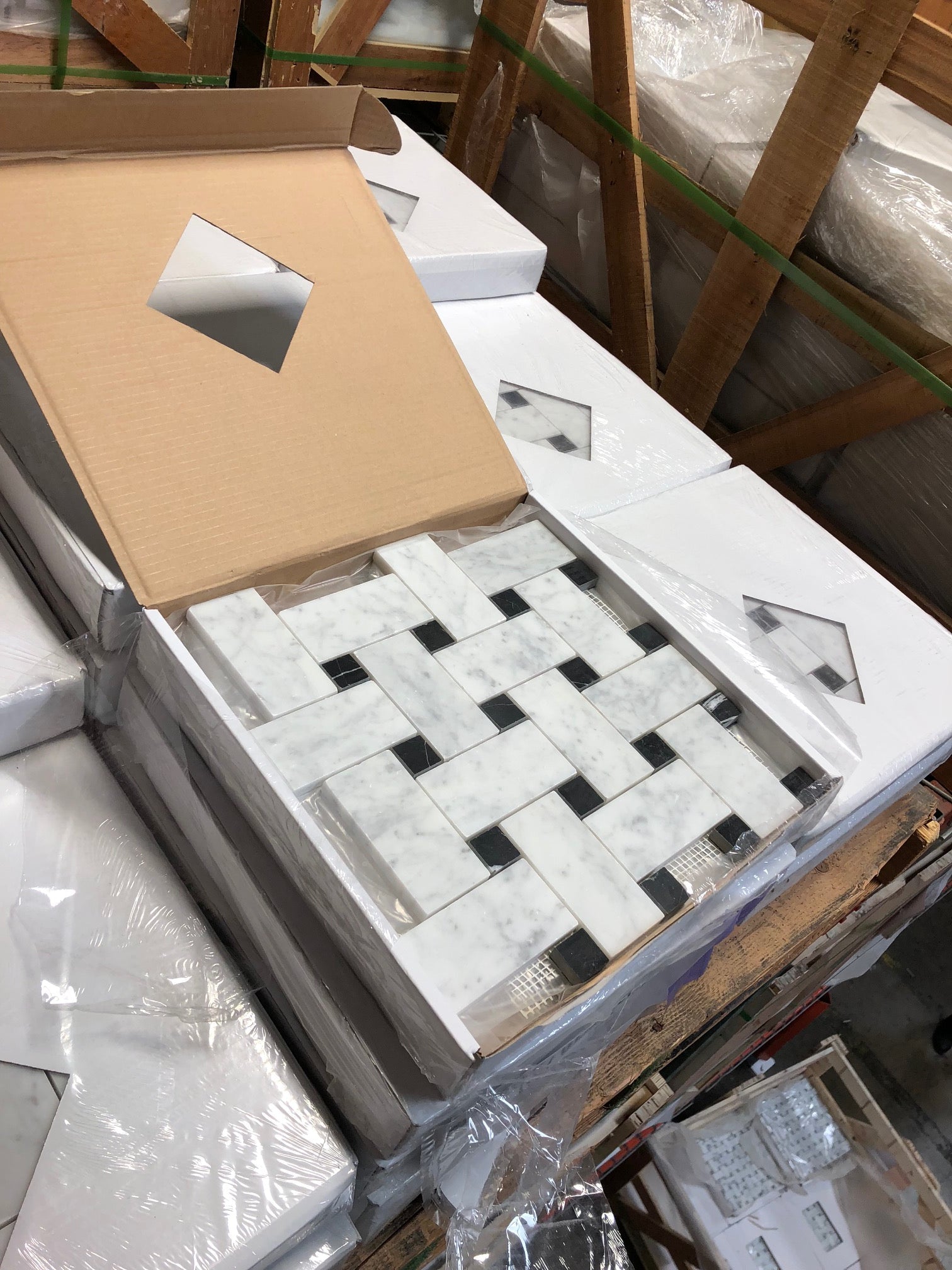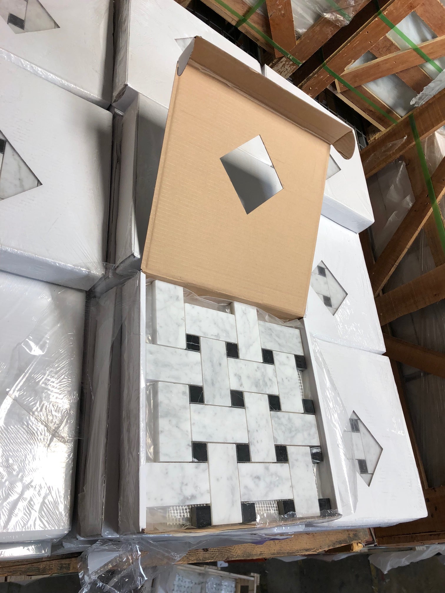 | Nombre del producto | Mosaico de tejido de canasta de mármol blanco de Carrara (italiano) con puntos negros (GRANDE) - 3/8 |
