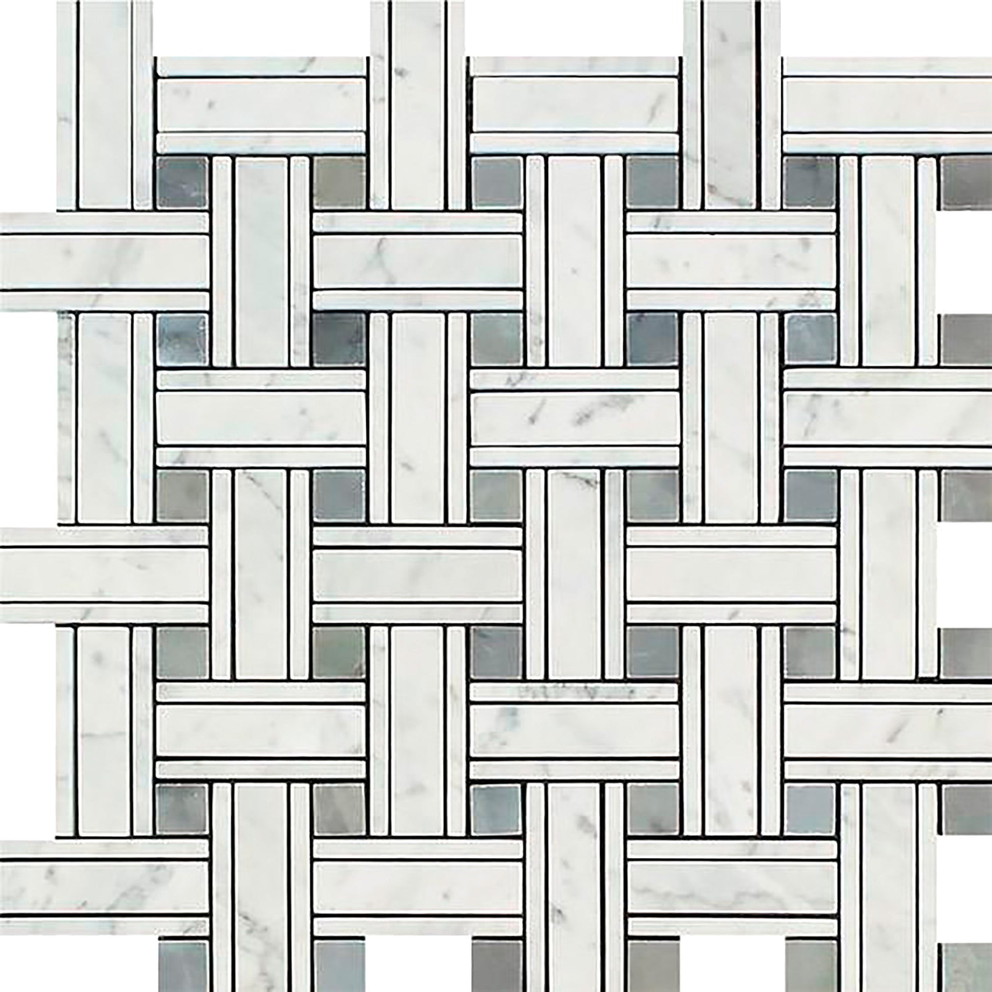 El mármol blanco Carrara (italiano) es famoso por sus revestimientos para salpicaderos de cocina y azulejos para suelos de ducha. Gracias a sus detalles en blanco, azul y gris, el mosaico Carrara Italian Triple Weave con revestimiento de mosaico azul y gris para pared y suelo ha cubierto miles de espacios con diseños de azulejos para baños de ensueño.
