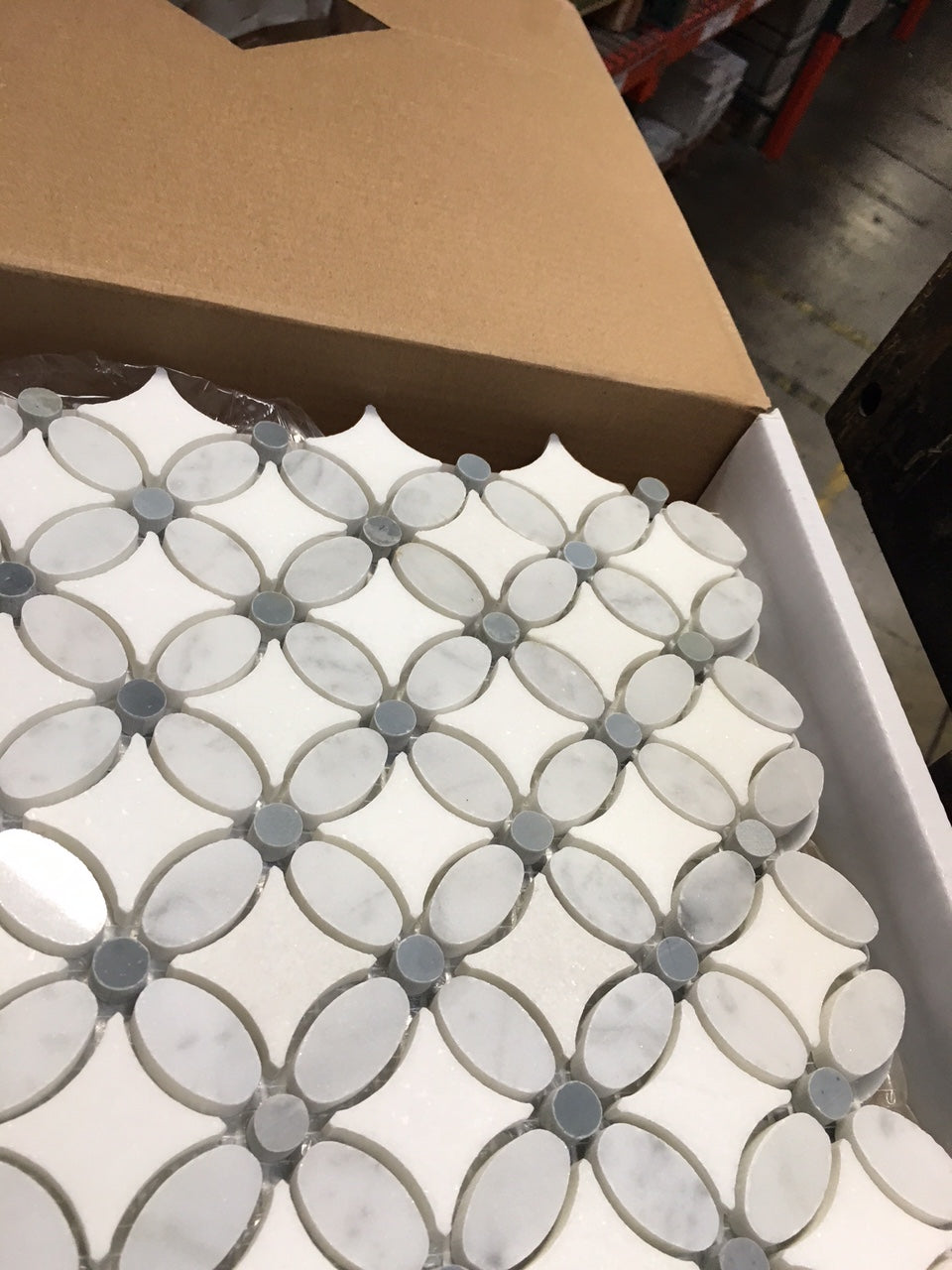 | Nombre del producto | Mosaico de mármol blanco de Carrara (italiano), flor de Florida (Thassos + blanco de Carrara (óvalo) + azul grisáceo (puntos)) 3/8 |