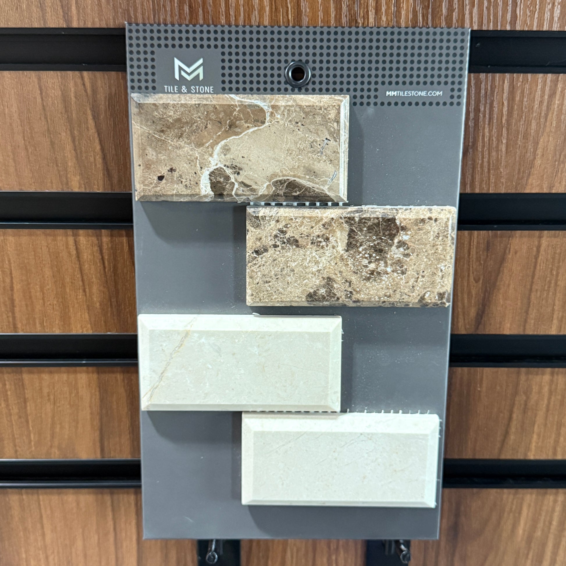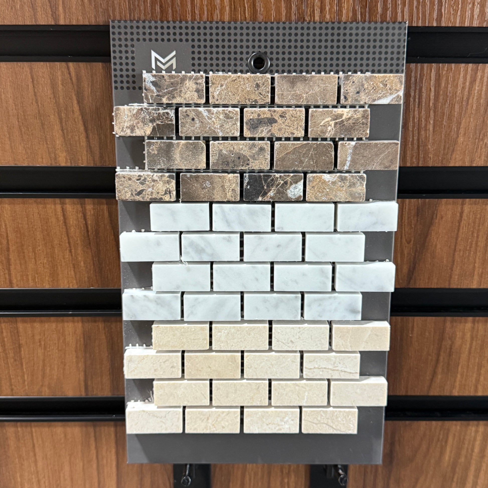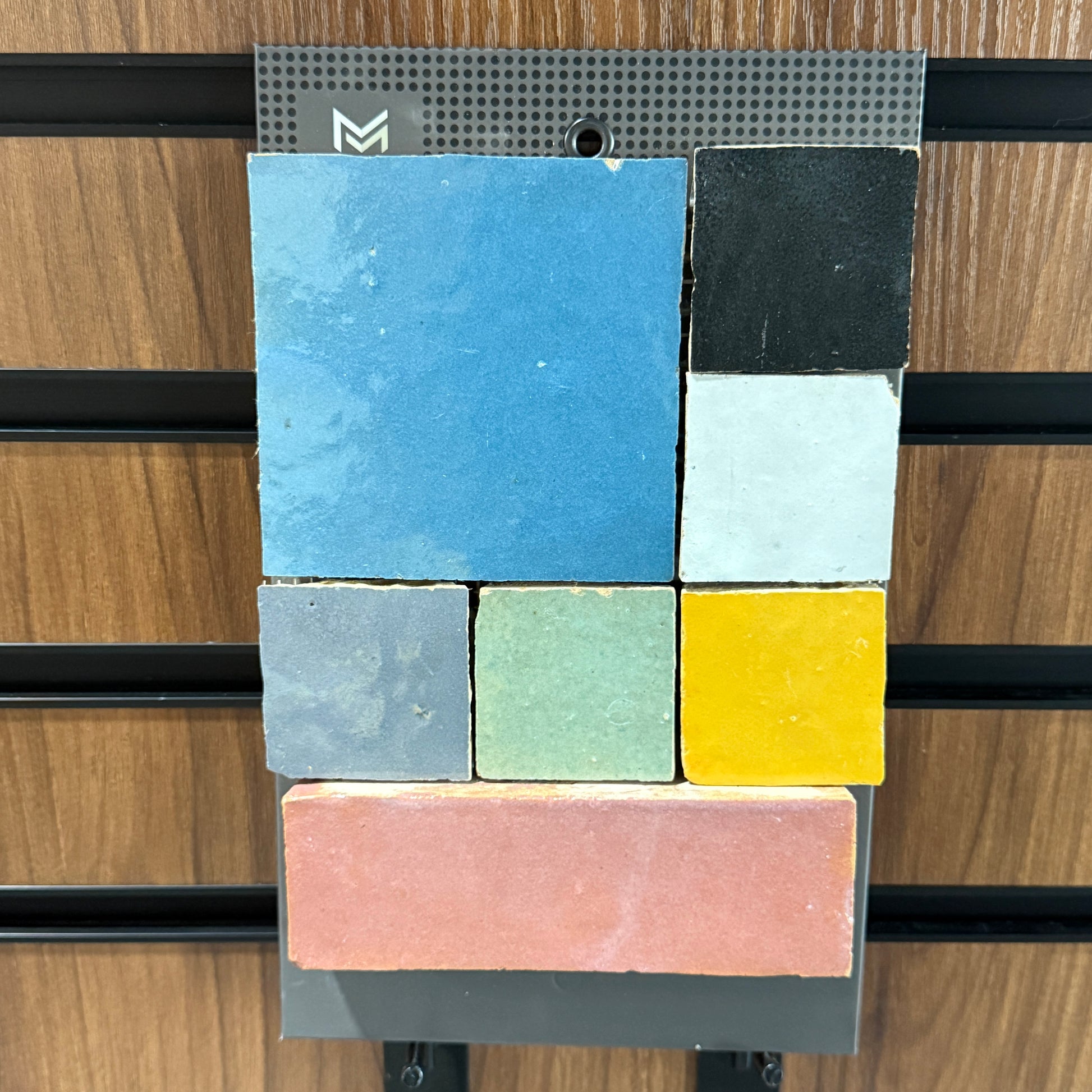 Cada expositor de cascada de 30 cm de ancho puede albergar 20 tarjetas de muestra. Disponemos de dos juegos de cartulinas de muestra de 15 x 25 cm para mostrar mosaicos y azulejos de diferentes tamaños. Estas cartulinas muestran las formas de mosaico más vendidas en diferentes colores. La mayoría de estas formas también están disponibles en otros colores. Consulte los códigos QR detrás de las tarjetas para ver todos los colores disponibles en esa forma específica.