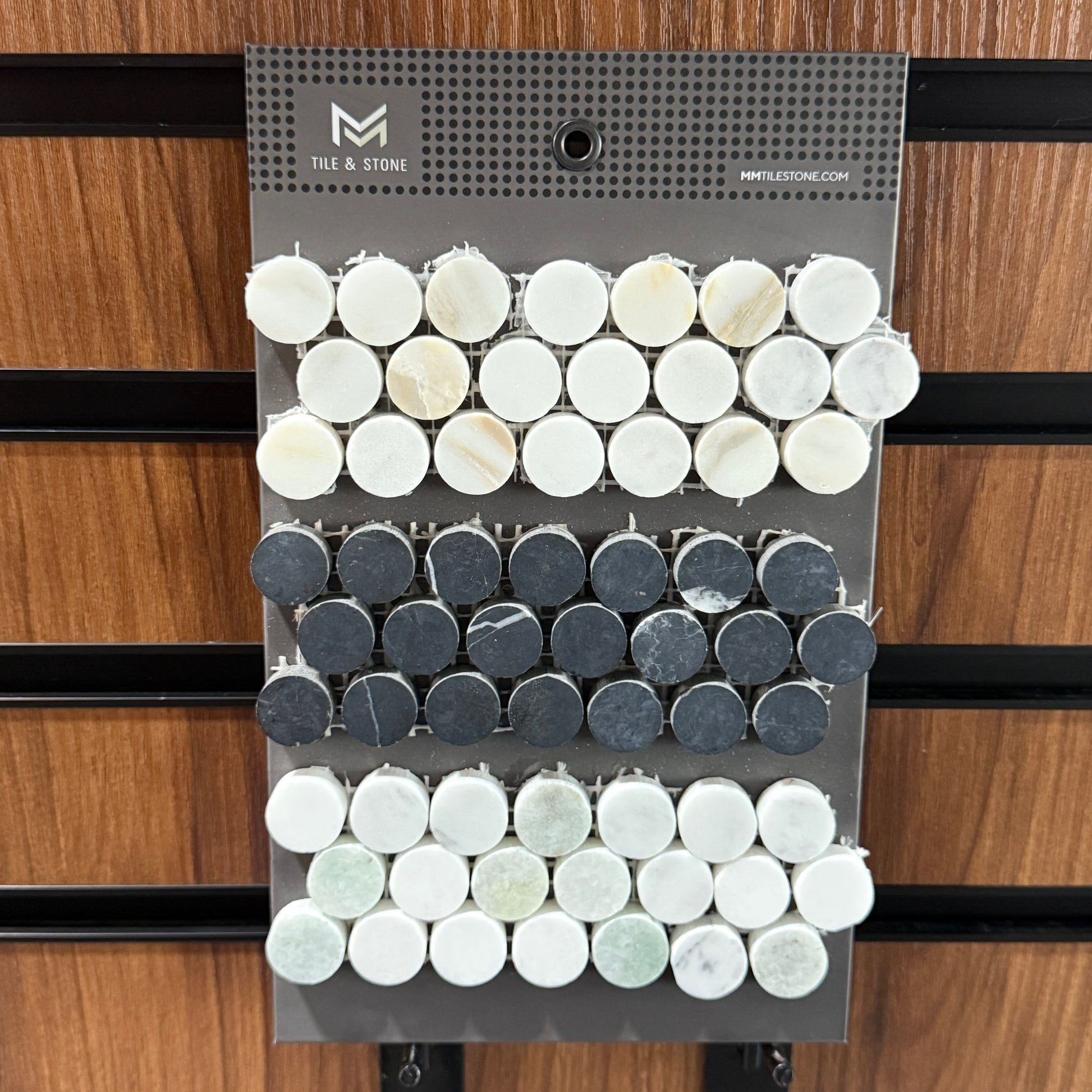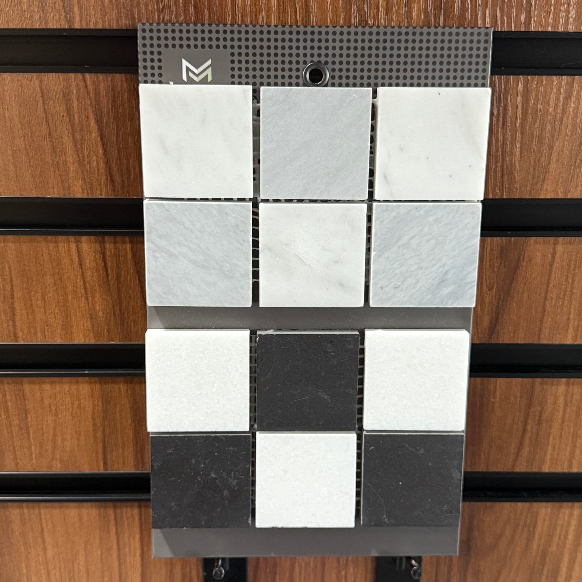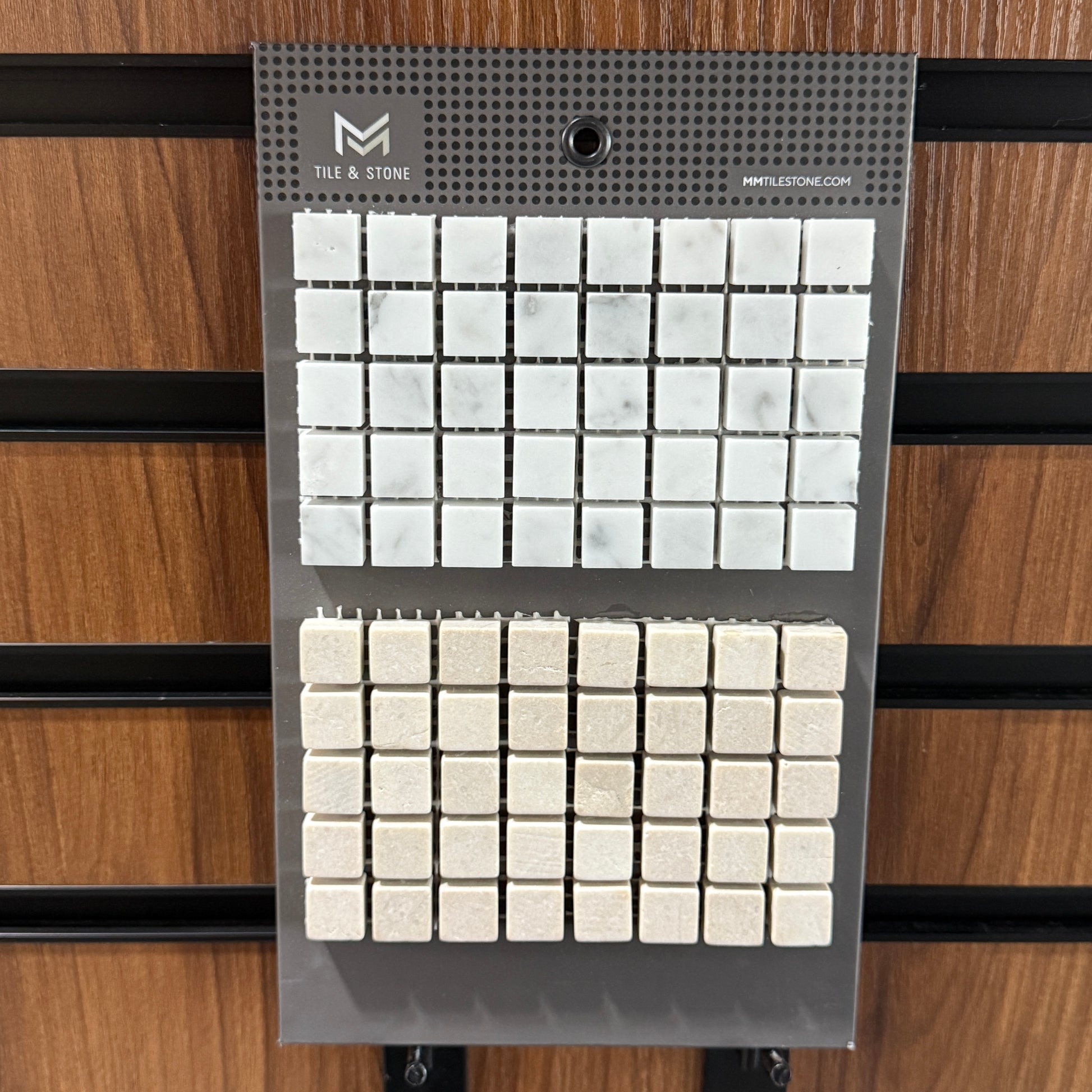 Cada expositor de cascada de 30 cm de ancho puede albergar 20 tarjetas de muestra. Disponemos de dos juegos de cartulinas de muestra de 15 x 25 cm para mostrar mosaicos y azulejos de diferentes tamaños. Estas cartulinas muestran las formas de mosaico más vendidas en diferentes colores. La mayoría de estas formas también están disponibles en otros colores. Consulte los códigos QR detrás de las tarjetas para ver todos los colores disponibles en esa forma específica.