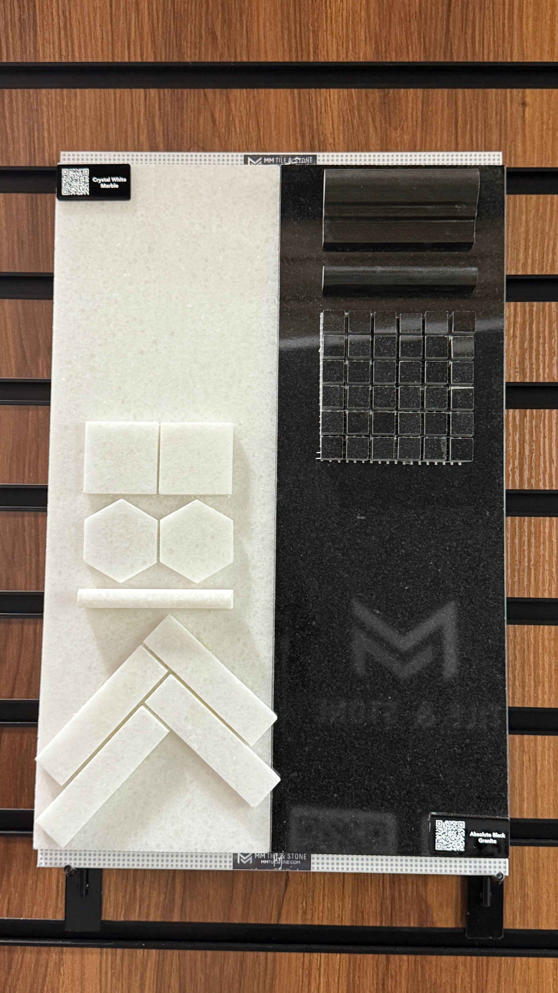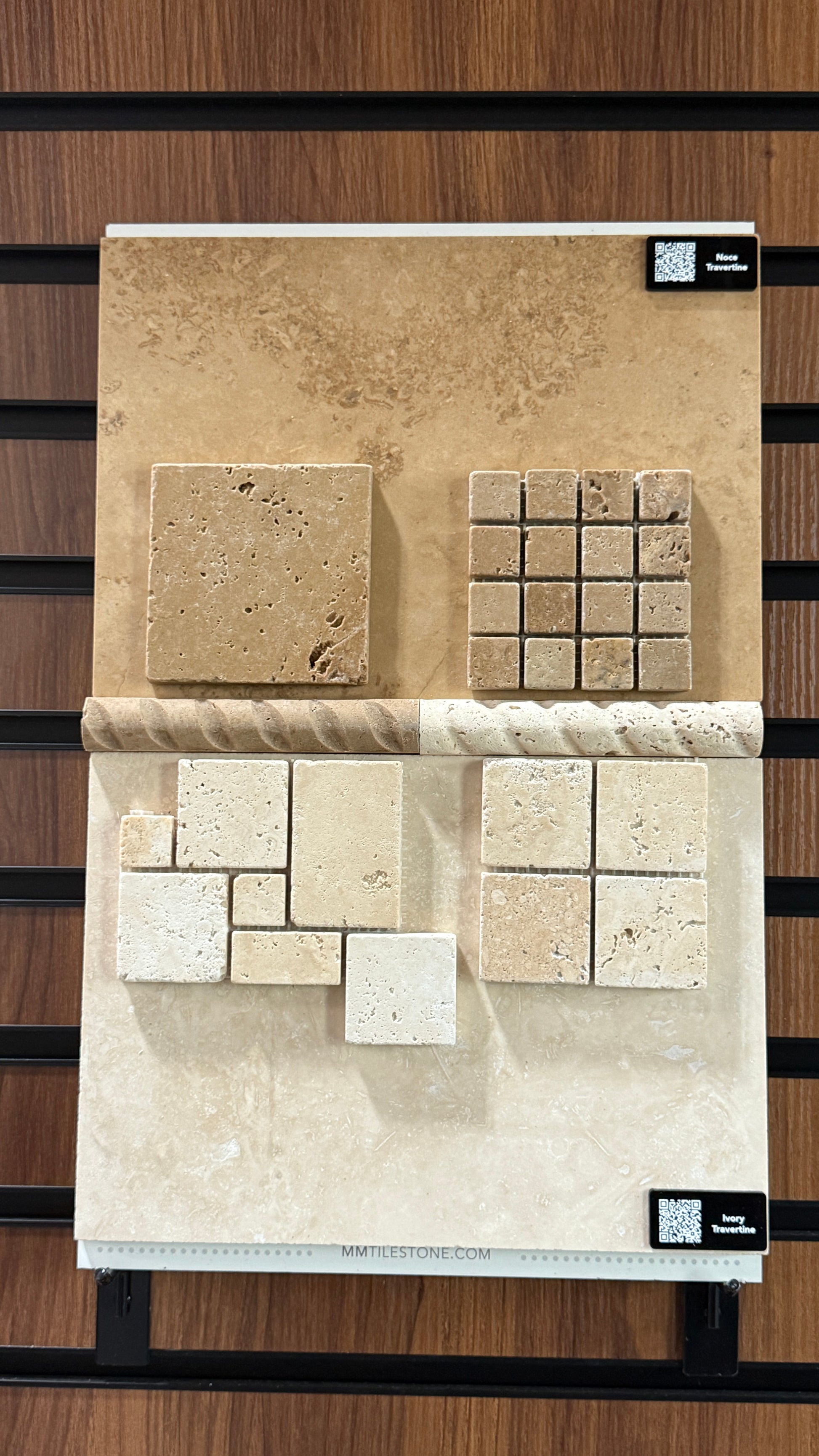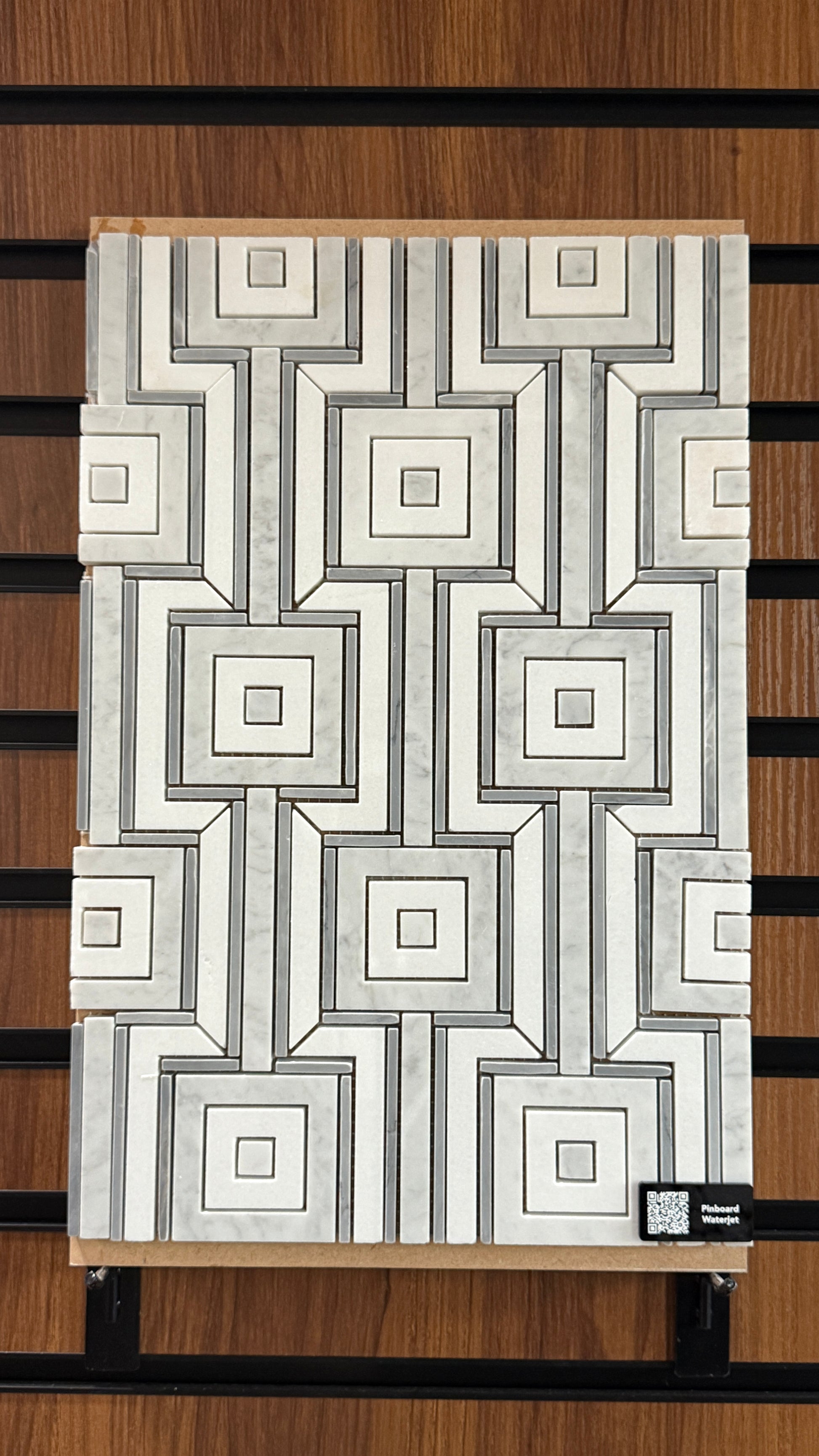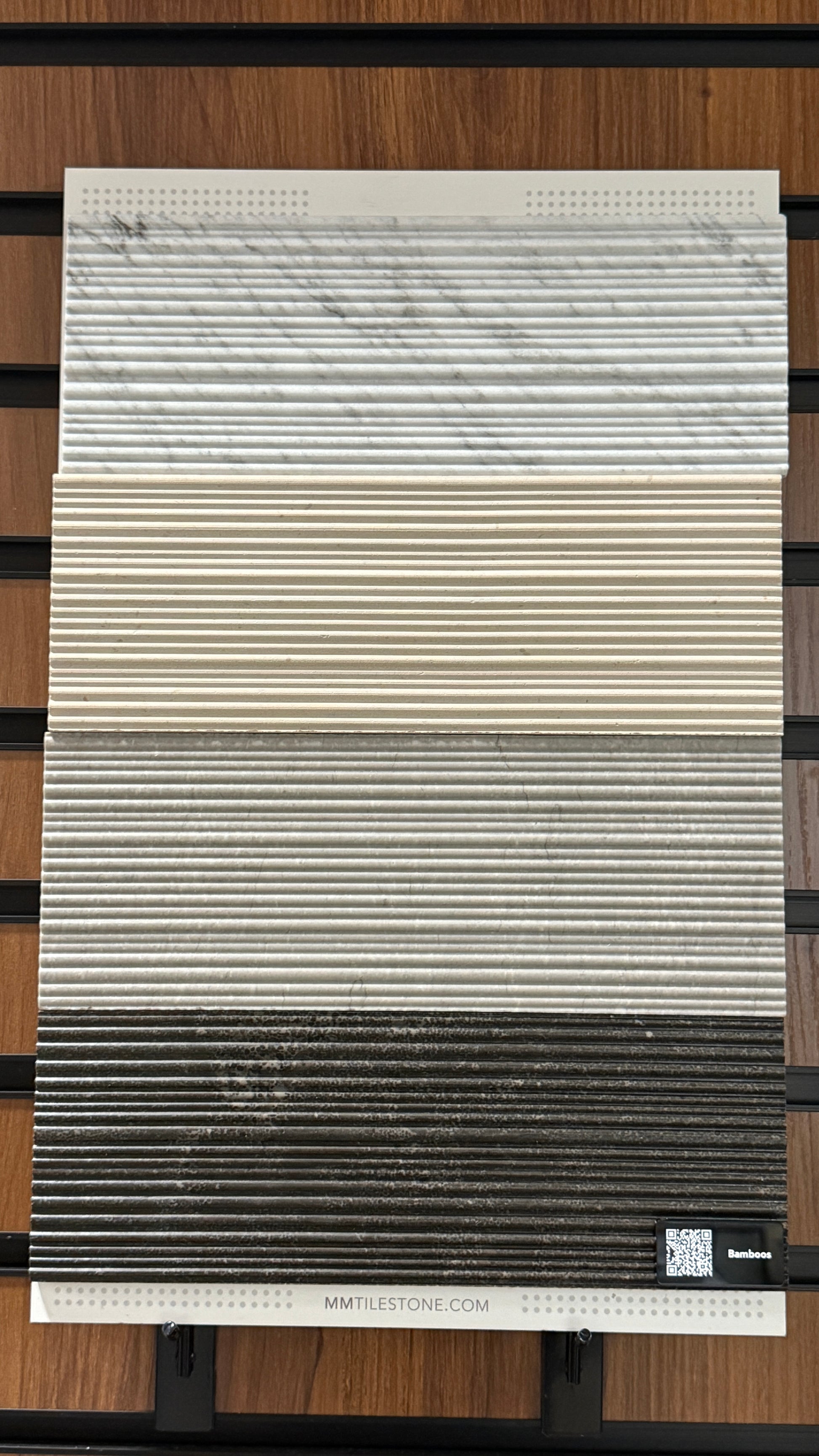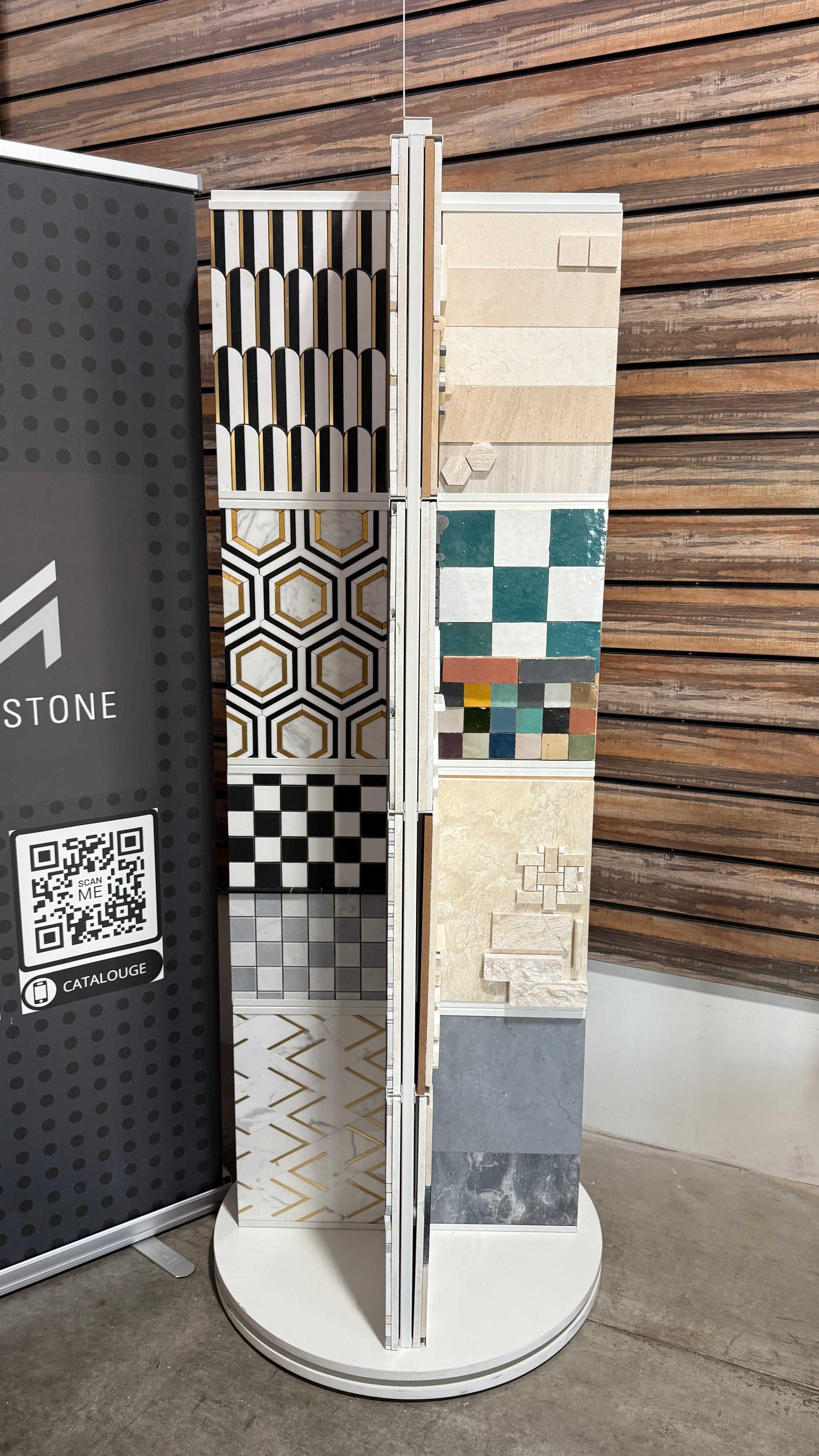 Esta torre permite exhibir 32 tableros de 30 x 48 cm. Cada tablero de 30 x 73 cm tiene uno o dos colores diferentes; un total de 50 colores se muestran en una sola exhibición, con azulejos, mosaicos y molduras de varios tamaños.