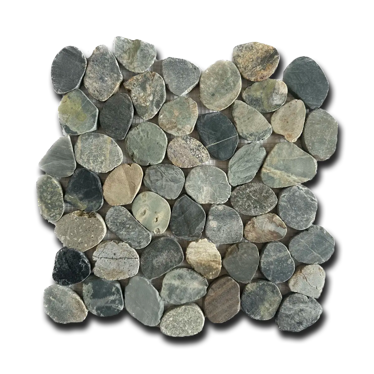 Mosaico de guijarros planos envejecidos en tonos tierra de 30 x 30 cm