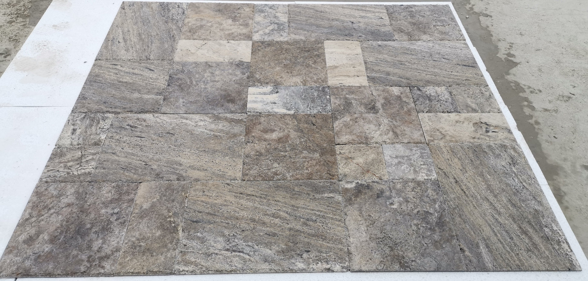| Nombre del producto | Travertino plateado con diseño francés Versalles 1/2 sin relleno, cepillado y cincelado |