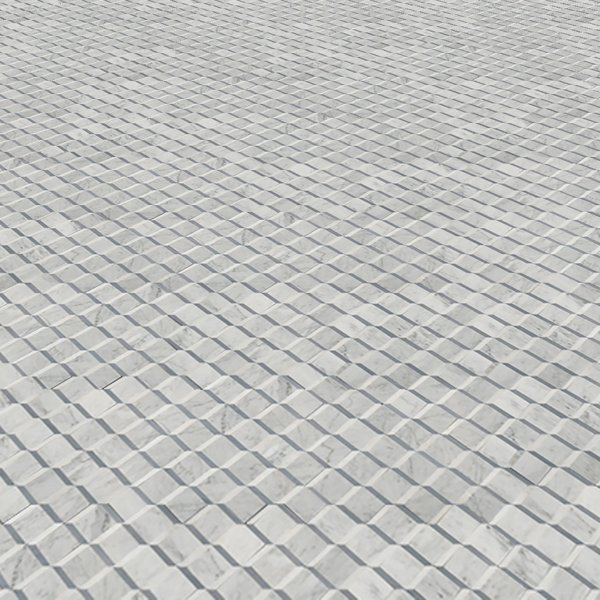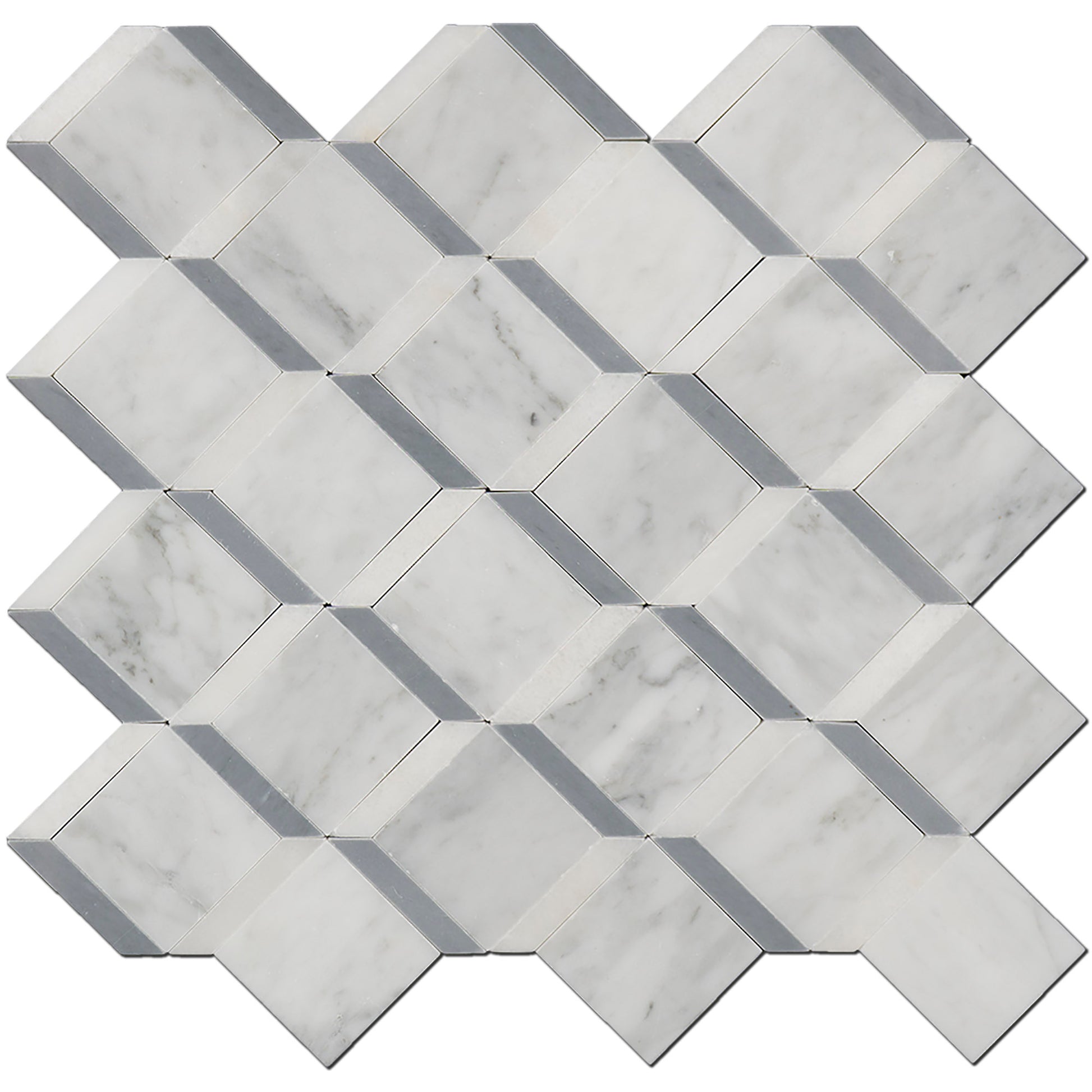 Mosaico de mármol Carrara y cubos 3D azul pulido de 11" x 12" y 3/8" con chorro de agua