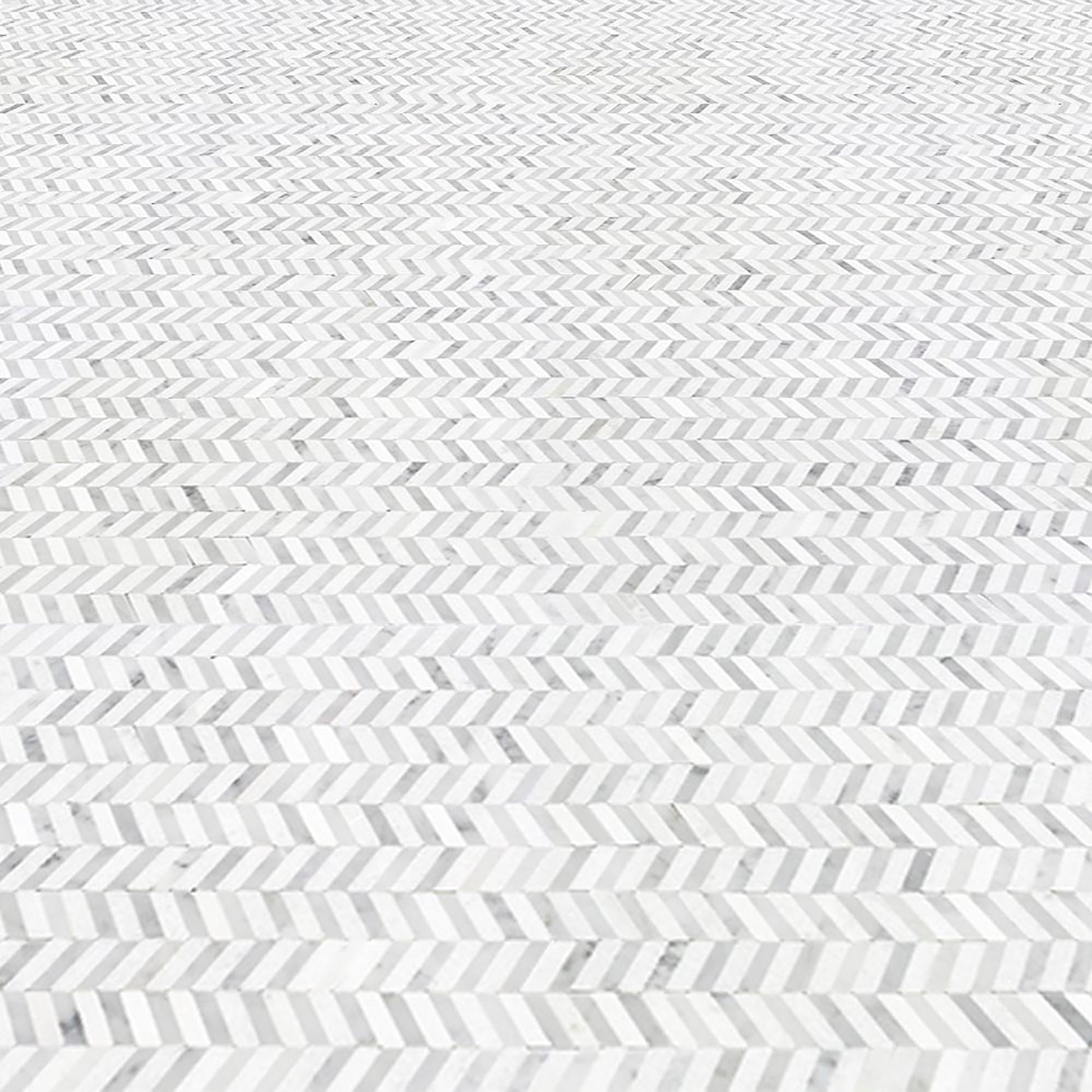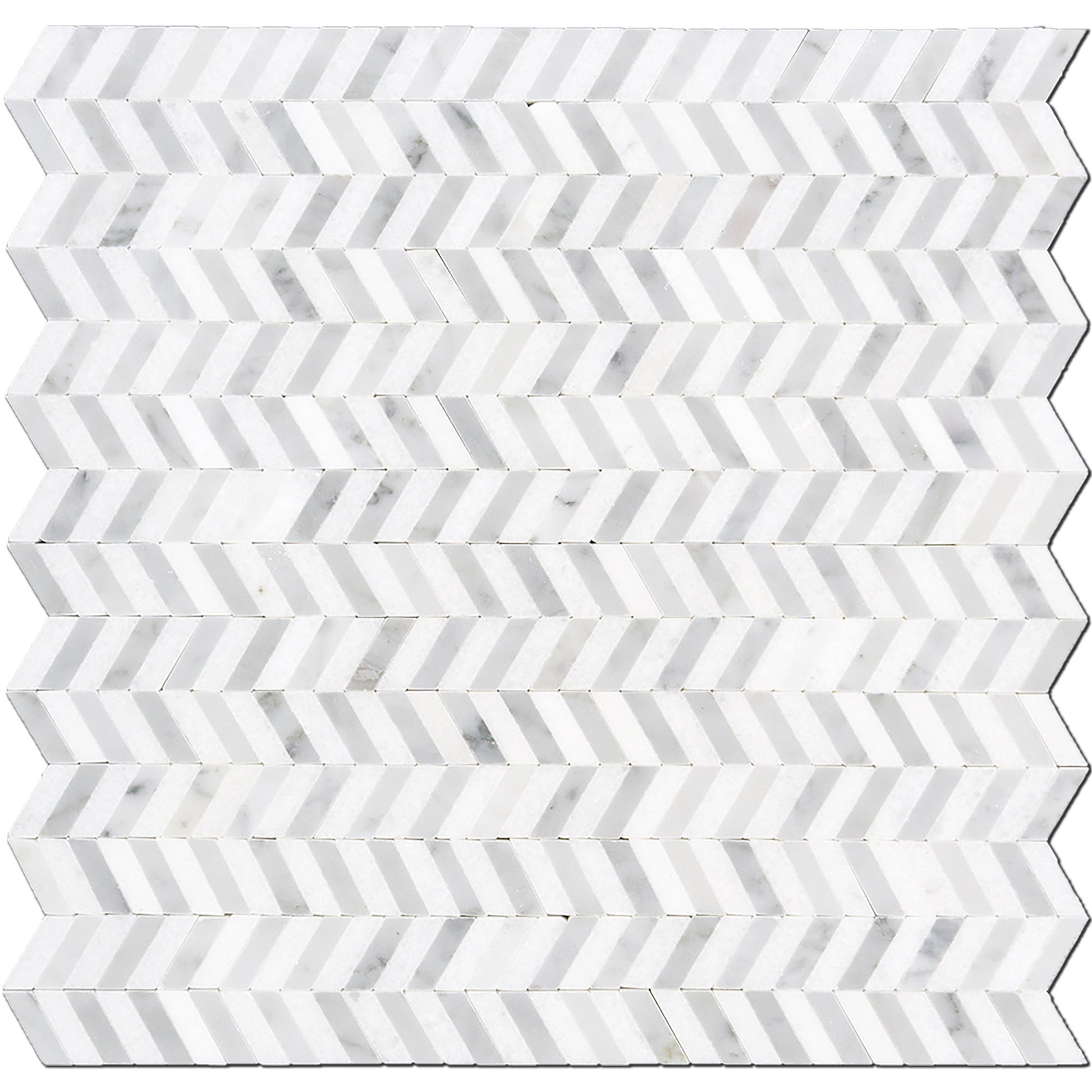 Mosaico de mármol Carrara y Thassos Mini Chevron pulido de 30,5 x 30,5 cm y 0,9 cm con chorro de agua
