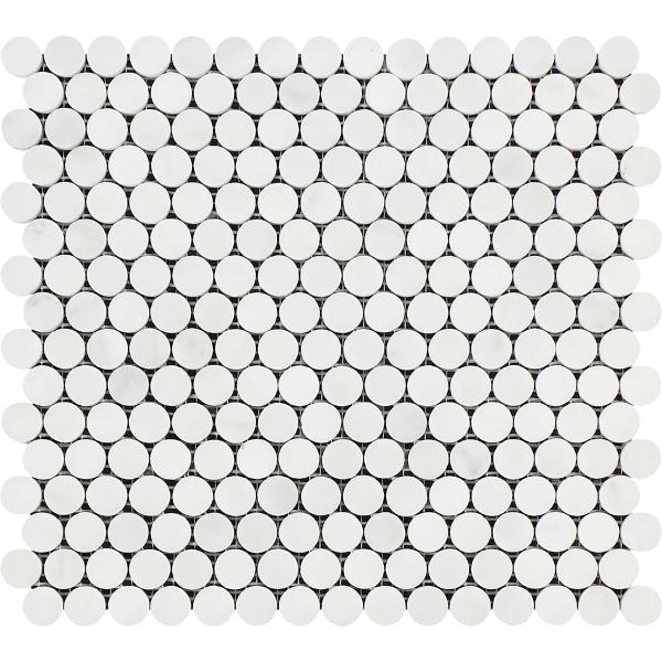 From Asia's mightiest mountains to your space Oriental White (Bianco Bello) Marble kitchen backsplash tile and mosaic floor tile will adorn your interior design. Oriental White Penny Round Mosaic Tile & Floor Mosaic is a mosaic tile that has little smooth cream and dark thin veins.
